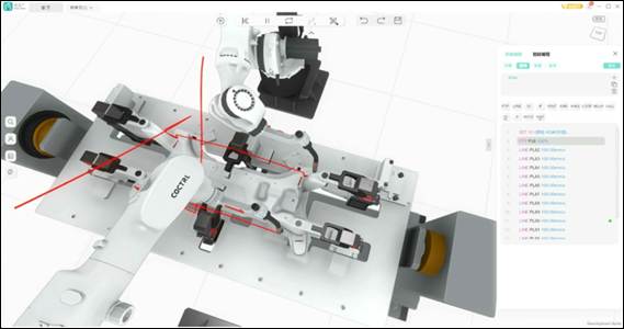 學(xué)生可通過示教完成產(chǎn)線的一部分程序編輯,通過智能編程完成工藝程序快速生成,再通過程序添加一系列邏輯(包括循環(huán)、多機器人調(diào)度等)進(jìn)行整條產(chǎn)線的運動調(diào)度,實現(xiàn)整條產(chǎn)線多機器人模式下的仿真。