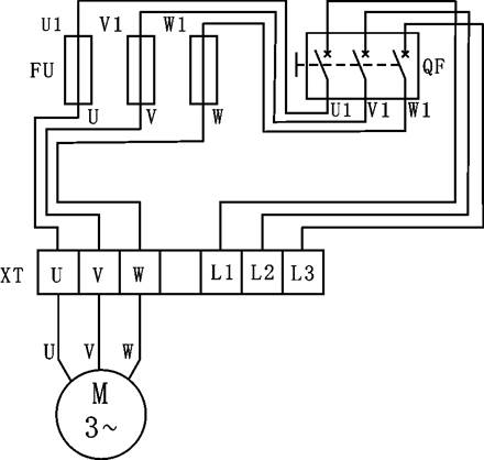 按圖1(b)的布置要求,在本裝置WD-22掛板上選擇熔斷器FU、開關(guān)QF及端子排XT等器件。電機M放在桌面上,安裝的動力電路采用黑色接線,保護導(dǎo)線PE采用黃綠雙色線,用專用的導(dǎo)線把接線端子排的L1、L2、L3三個插頭分別插進電源控制屏的L1、L2、L3插頭。安裝后應(yīng)符合第二章的要求。