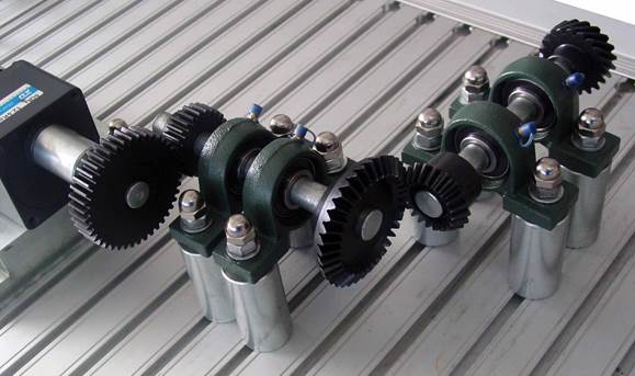 B、將一對斜齒輪分別緊固在兩傳動(dòng)軸上,移動(dòng)軸承支架對齊兩斜齒輪。如果高度不合適可墊墊圈調(diào)整。