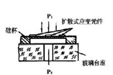 丈量敏感元件為周邊固支的硅杯,在此杯單晶硅膜片的上下兩側出現(xiàn)壓差時膜片內部孕育發(fā)生應力。在壓力P1、P2 作用下電橋出現(xiàn)不均衡,輸出一個正比于壓力變革的電壓信號。