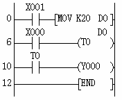 定時(shí)器的設(shè)定值,可以用常數(shù)(K)直接指定,也可用數(shù)據(jù)寄存器(D)間接指定。但間接指定值必須事先寫入數(shù)據(jù)寄存器里。