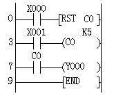 計(jì)數(shù)輸入X001每驅(qū)動(dòng)C0線圈一次,計(jì)數(shù)器的當(dāng)前值就增加1,在執(zhí)行第5次的線圈指令時(shí),輸出觸動(dòng)作。以后即使計(jì)數(shù)輸入X001再動(dòng)作,計(jì)數(shù)器的當(dāng)前值不變。如果復(fù)輸入X000為ON,則執(zhí)行RST指令,計(jì)數(shù)器的當(dāng)前值為0,輸出觸點(diǎn)復(fù)位。