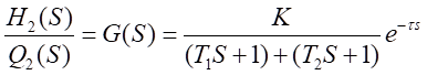 根據(jù)物料動態(tài)平衡關(guān)系,并考慮到液體傳輸過程中的時延,其傳遞函數(shù)為: