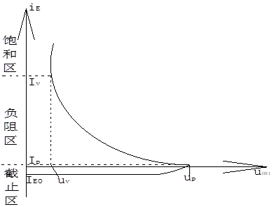 單結晶體管的特性曲線如圖2-2-14所示當UBE1=0時,IE=IEO;當UEB1增大至UP(峰點電壓時),PN結開始正向?qū),此時IE=IP(峰點電流);UEB1再增大一點管子就進入負阻區(qū),隨著IE增大,UEB1減小,直至UEB1=UV(谷點電壓),IE=IV(谷點電流),UV取決于PN結的導通電壓和rb1 的飽和電阻rs;當IE再增大,管子進入飽和區(qū)。單結晶體管的三個區(qū)如圖2-2-14所標注。
