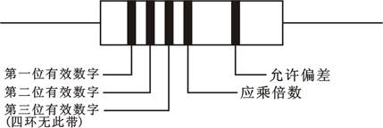 四環(huán)色標是在五環(huán)基礎上去除第三環(huán);三環(huán)色標是在五環(huán)基礎上去除第三環(huán)和第五環(huán),這時允許偏差約定為±20%。色標的含義見表2-2-3