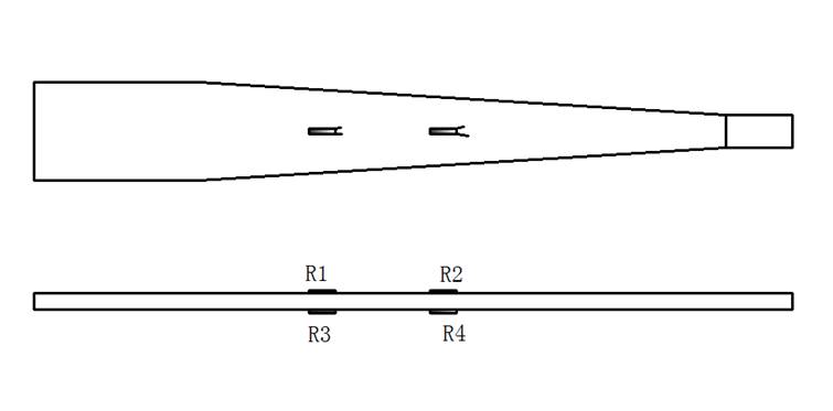 在等強(qiáng)度梁的上下表面沿縱向粘貼了四個(gè)電阻應(yīng)變片,用于測(cè)定該四點(diǎn)處的應(yīng)變,它們分別是R1,R2,R3, R4,如圖4-1所示。