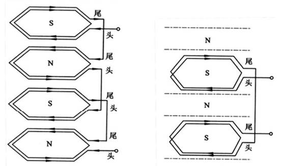 · 極相組的連接。在一個極下的,屬于同一相的所有線圈串聯(lián)在一起,稱為一個極相組。為了保證三相電動機線圈連接之后,能形成 N 極和 S 極相間的排列,各極相組之間的連接,必須是頭頭相拉,如圖 5-1(a)所示。但也有如圖 5-1(b)所示的頭尾相接,這時可以看到,同樣是四極三相電動機,它只有兩個極相組,因而它必須是頭尾相接,才能形成四極的磁場,但此種接法通常用于單繞組多速三相電動機。在中小型電動機中,一個極相組內的線圈一般是連續(xù)繞制的,因此不用接頭。(a)頭頭和尾尾相接 (b)頭尾相接