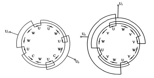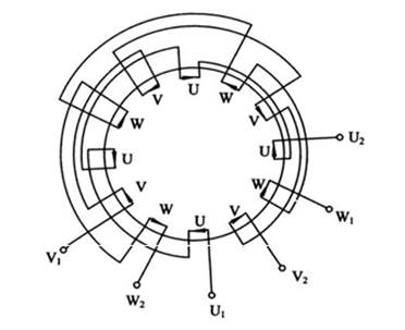 ② 用不同的顏色區(qū)分頭尾,且用 U1、V1、W1 標明繞組的始端,U2、V2、W2 標明繞組的末端。