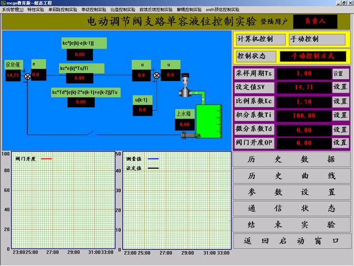 9.點擊“確認”,用戶登錄完畢。選擇“單回路控制實驗”下拉菜單中的“電動閥支路單容液位控制實驗”,出現(xiàn)如圖3.10所示的“電動閥支路單容液位控制實驗”界面。