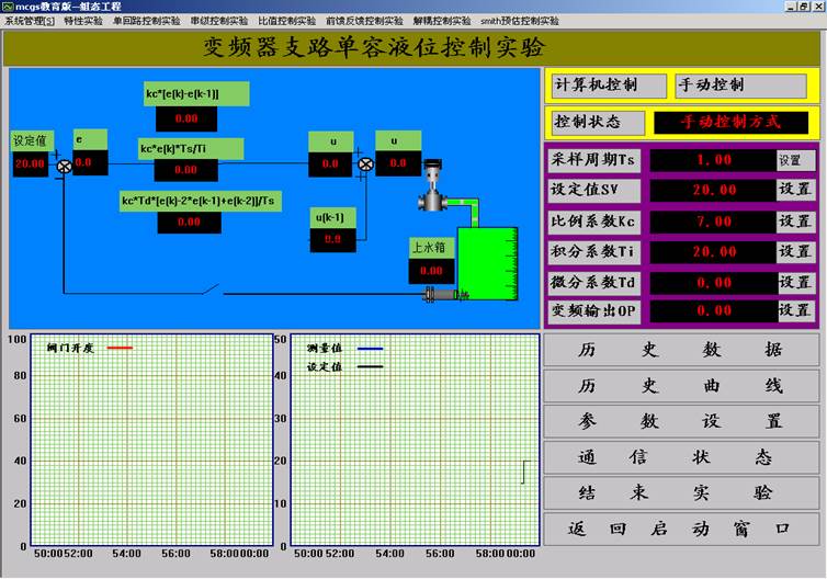 7.點擊“確認(rèn)”,用戶登錄完畢。選擇“單回路控制實驗”下拉菜單中的“變頻器支路單容液位控制實驗”。出現(xiàn)如圖3.11所示的“變頻器支路單容液位控制實驗”界面。