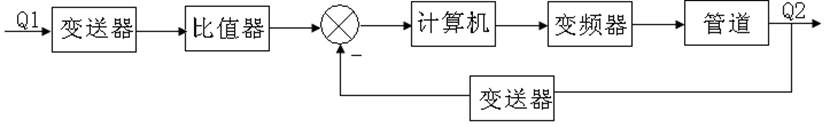 本實驗采用計算機(jī)控制。調(diào)節(jié)比值器將其支路的流量作為設(shè)定值,計算機(jī)根據(jù)流量設(shè)定值和P、I、D參數(shù)進(jìn)行PID運(yùn)算,輸出信號給變頻器,然后由變頻器控制變頻器供水系統(tǒng)的進(jìn)水流量,從而達(dá)到控制流量比例恒定的目的。