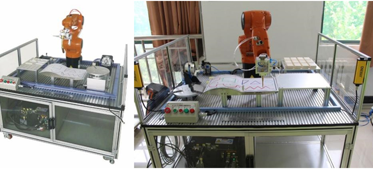 模塊整體臺架材料為優(yōu)質(zhì)鋁型材,一體畫板由不銹鋼板制成,表面覆蓋PVC膜;具有TCP標定工具,可實現(xiàn)機器人工具TCP標定練習;實現(xiàn)基本軌跡編程練習,提供三角形、矩形、圓形及多線段圖形,訓練不同的編程指令,實現(xiàn)在平面及空間復雜教學軌跡。