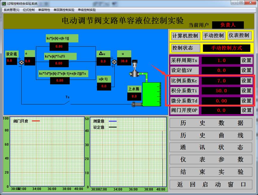 本實(shí)驗(yàn)采用儀表控制,將液位控制在設(shè)定高度。根據(jù)上水箱液位信號LT1輸出給儀表,智能儀表根據(jù)P、I、D參數(shù)進(jìn)行PID運(yùn)算,輸出信號給電動調(diào)節(jié)閥,然后由電動閥控制水泵1供水系統(tǒng)的進(jìn)水流量,從而達(dá)到控制設(shè)定液位基本恒定的目的。