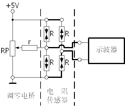 將電阻式傳感器與振動臺相連,在振動臺的帶動下,可以觀察電阻式傳感器動態(tài)特性,電路圖如圖5-1。