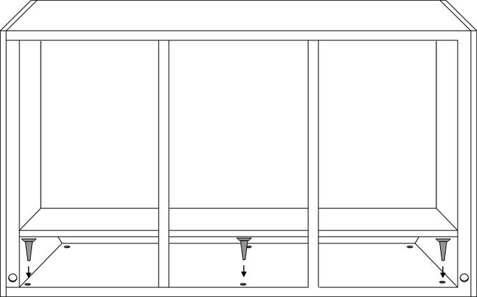 ② 將桌體翻轉(zhuǎn),圍板與萬向輪一同安裝到實驗臺桌身,注意孔位對齊。按照右圖所示