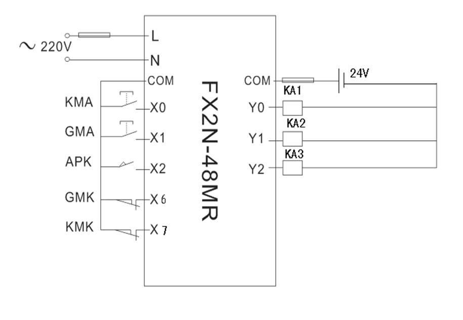 | KMA | 開門按鈕 | X0 | GMJ(KA1) | 關(guān)門繼電器 | Y0 |