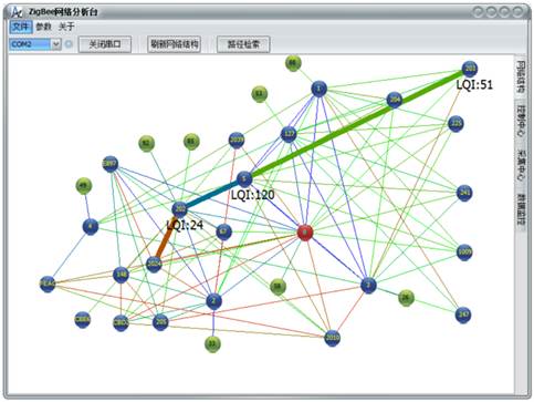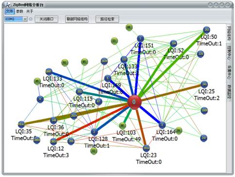 ZigBee 串口透傳模塊及配套方案是基于 IEEE 802.15.4/ZigBee 協(xié)議棧的 2.4G ZigBee 無線串口透明傳輸通信模塊。模塊采用十年來行業(yè)主流的 TI 高性能低功耗的 2.4G 射頻收發(fā)芯片 CC2530 及大功率低噪聲射頻前端芯片 CC2591,實(shí)現(xiàn)極易使用、全透明、高穩(wěn)定、超低功耗、超遠(yuǎn)距離、超大規(guī)模 ZigBee 無線傳感網(wǎng)絡(luò)的組網(wǎng)。典型的 ZigBee 網(wǎng)絡(luò)如圖 1.1 與圖 1.2 所示。圖截取自我司可視化 ZigBee 實(shí)時控制調(diào)試工具。 ZigBee 網(wǎng)絡(luò)是一種小數(shù)據(jù)量的無線射頻網(wǎng)絡(luò),由非休眠的主機(jī)(CO)、路由(RO)與休眠的終端(EN) 節(jié)點(diǎn)構(gòu)成,圖中分別由紅、藍(lán)、綠色點(diǎn)表示。網(wǎng)絡(luò)有如下特點(diǎn):