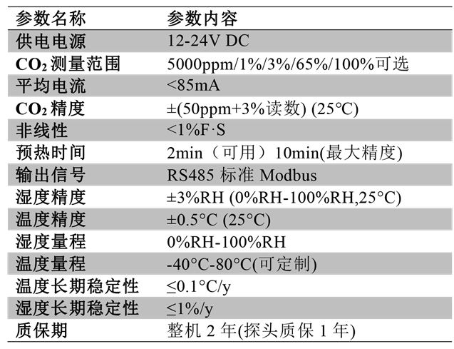 表2-1 二氧化碳傳感器參數(shù)表