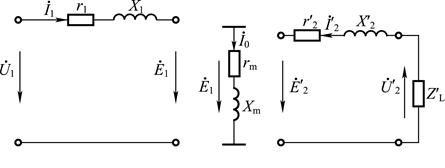 1.相關知識 1)負載運行時的物理情況 2)負載運行時的電磁關系 (1)磁動勢平衡方程式 空載時的主磁通 這一關系式稱為磁動勢平衡方程式。 式(3-18)兩邊同除以N1并移相,得: 由式(3-19)可知,當負載電流增大時, (2)電壓平衡方程式 3)負載運行時的等效電路 (1)繞組的折 (2)“T”形等效電路 經過折算繞組,可得變壓器的部分等效電路,如圖3-16(a)所示。其中一、二次側之間的耦合作用,由主磁通在繞組中產生的感應電動勢 ![]() (a)部分等效電路 ![]() (b)“T”形等效電路 圖3-16 變壓器的“T”形等效電路的形成過程 (3)近似和簡化等效電路 |