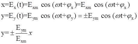 如果Ex和Ey同相,或者相差180°,則這兩個(gè)分量的合成矢量的空間取向就始終在一條直線上,這就是說(shuō)在式中如果fx-fy=0或fx-fy=p就代表一個(gè)直線極化的均勻平面電磁波。
