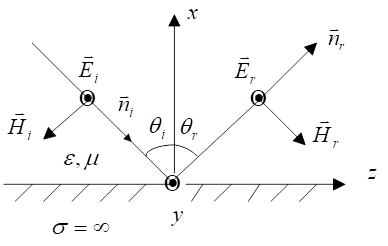 電磁波不能進(jìn)入理想導(dǎo)體,所以在理想導(dǎo)電平面上,入射的電磁波必然會(huì)被反射。反射波與入射波在相反的方向上傳播,設(shè)反射波的電場(chǎng)強(qiáng)度為
