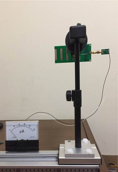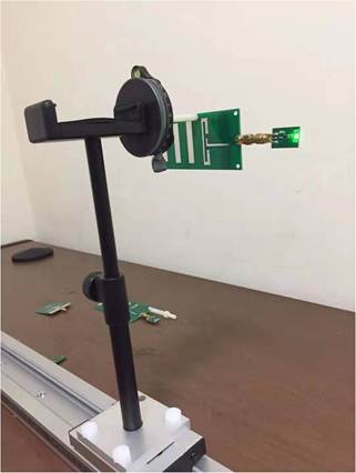 圖3用微安表測(cè)量H面方向圖測(cè)量 圖4用LED燈的強(qiáng)弱顯示天線E面方向圖
