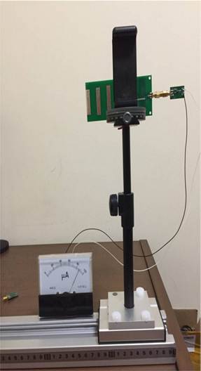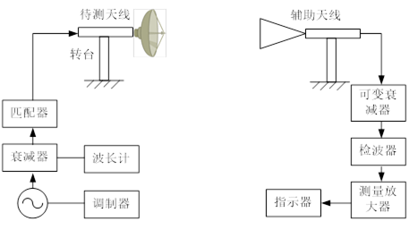 天線的方向圖,測(cè)試系統(tǒng)框圖如下圖2所示。輔助天線作發(fā)射,由功率信號(hào)發(fā)生器激勵(lì)產(chǎn)生電磁波;被測(cè)天線作接收,被測(cè)天線置于可以水平旋轉(zhuǎn)的實(shí)驗(yàn)支架上,接收到的高頻信號(hào)經(jīng)檢波后送給電流指示器顯示。