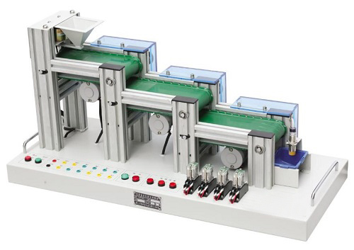 自動送料裝車實訓模型能模擬實際的自動送料裝車系統(tǒng)的工作狀況,由漏斗上料裝置、三級傳送帶、電磁鐵、直流電機、電容傳感器、故障開關、指示燈、模擬小車等組成,通過PLC編程,對電機、電磁鐵進行較復雜的開關量控制、時序邏輯控制,完成自動上料過程。自動送料裝車實訓模型還設置了故障開關,可使學生掌握自動送料裝車系統(tǒng)的操作及故障檢測能力,是各類院校電氣類專業(yè)進行實訓的理想模型。