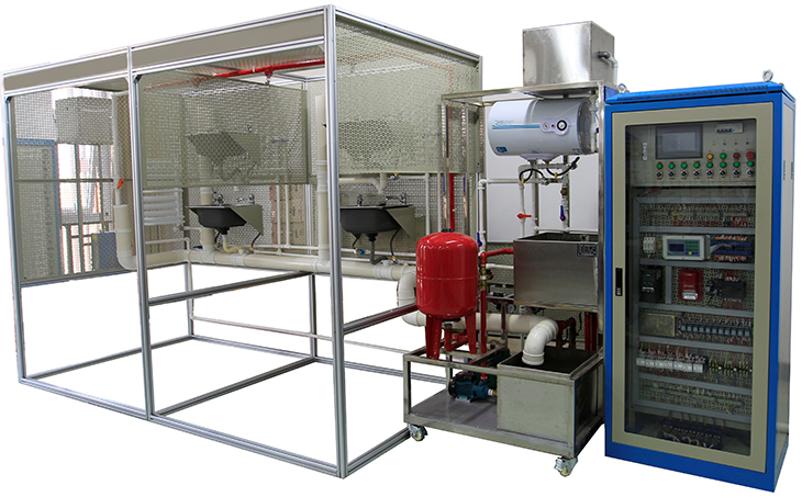 7.生活給水系統(tǒng):主要有給水箱、給水泵、給水管道、壓力變送器、脈沖水表、水龍頭和淋浴頭等組成。管路采用不銹鋼復(fù)合管進(jìn)行設(shè)計(jì),可進(jìn)行不銹鋼復(fù)合管的切割、安裝和通水試驗(yàn)操作,通過控制系統(tǒng)可實(shí)現(xiàn)生活給水系統(tǒng)的變頻恒壓供水功能,實(shí)現(xiàn)單泵變頻控制或雙泵切換控制等功能;通過脈沖式水表可以完成用水量的計(jì)量。