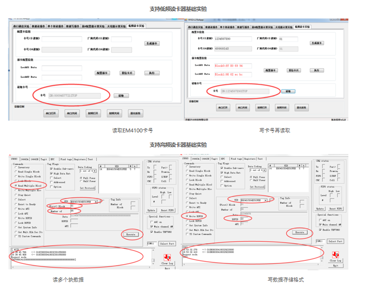 單卡及多卡EPC識(shí)別:?jiǎn)尾阶R(shí)別、單標(biāo)簽循環(huán)識(shí)別、防碰撞識(shí)別; 單卡及多卡TID識(shí)別實(shí)驗(yàn):標(biāo)簽識(shí)別號(hào); 標(biāo)簽UII塊區(qū)讀寫操作:指定UII讀寫、不指定UII讀寫、多字節(jié)寫 GEN2標(biāo)簽的USER多字節(jié)數(shù)據(jù)讀寫 GEN2標(biāo)簽的安全操作 GEN2標(biāo)簽的鎖定操作 |