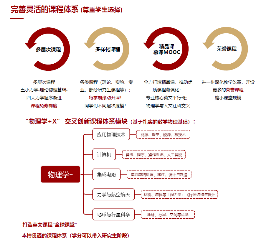 學(xué)院構(gòu)建了“全覆蓋、模塊化、分層次”課程體系。在專業(yè)基礎(chǔ)課程上,學(xué)院實(shí)施模塊化教學(xué)。普通物理、理論物理等核心課程均在模塊內(nèi)設(shè)置了深度、難度、廣度不同的兩類課程,為學(xué)生的自由發(fā)展提供了制度保障和選擇權(quán)。同時(shí),學(xué)院還將所有研究生核心課程及必修課程對(duì)本科生開(kāi)放,全面實(shí)施本科生-研究生課程貫通模式,并可以選擇把學(xué)分帶到研究生學(xué)習(xí)階段。