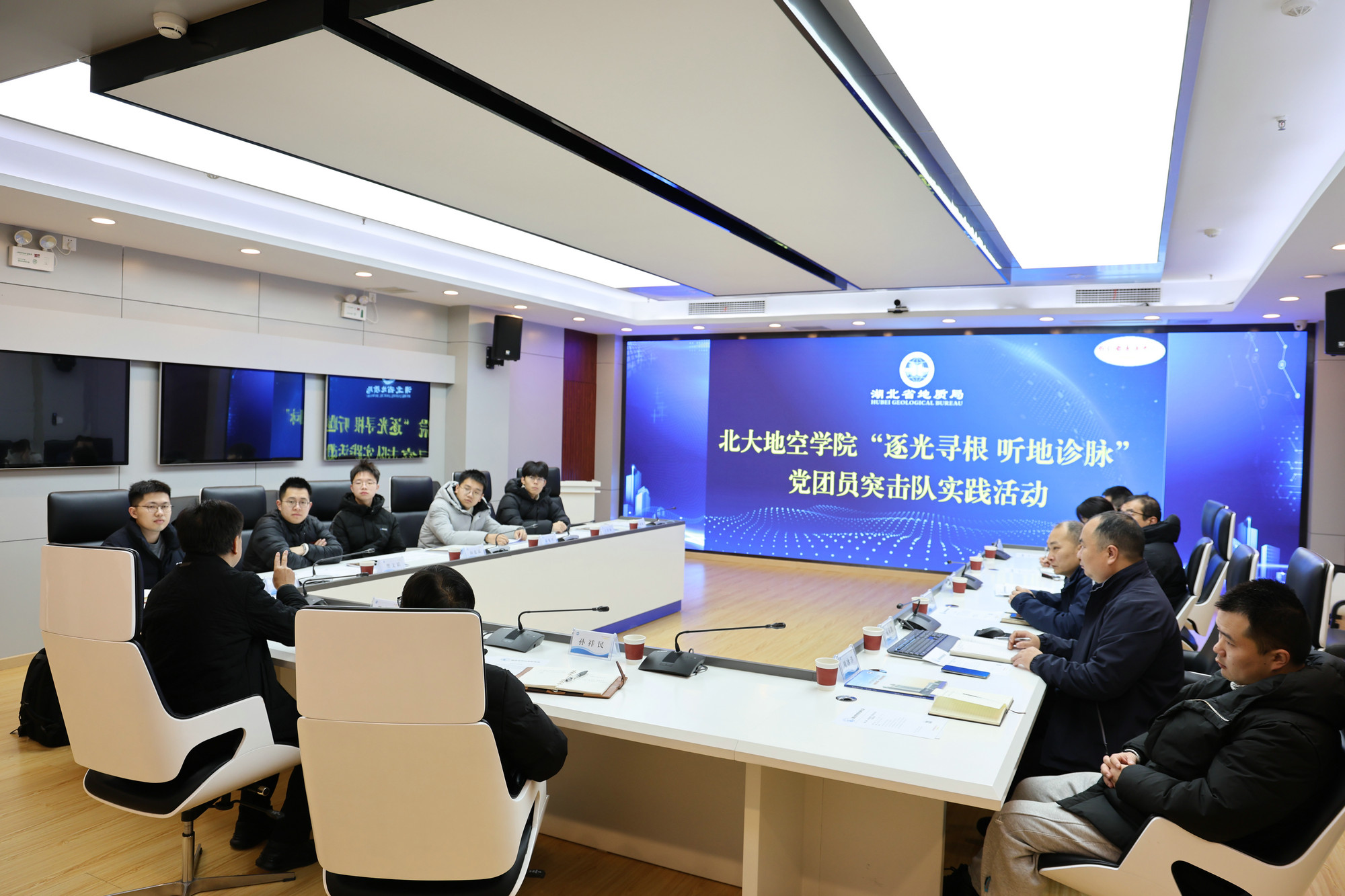 在鄂期間,突擊隊與湖北省地質(zhì)局、湖北省地質(zhì)調(diào)查院、湖北省地質(zhì)科學研究院、湖北省第三地質(zhì)大隊及武漢光谷互連科技有限公司等單位開展座談交流。湖北省地質(zhì)調(diào)查院黨委書記孫祥民、湖北省地質(zhì)科學研究院原黨委副書記胡遠清、湖北省李四光研究會秘書長戴光忠等領導專家出席座談。校地雙方聚焦地質(zhì)大數(shù)據(jù)建設與新一輪找礦突破戰(zhàn)略行動,就如何發(fā)揮北京大學科研優(yōu)勢、利用分布式光纖傳感系統(tǒng)等國產(chǎn)高端裝備解決一線找礦難題進行深入探討。