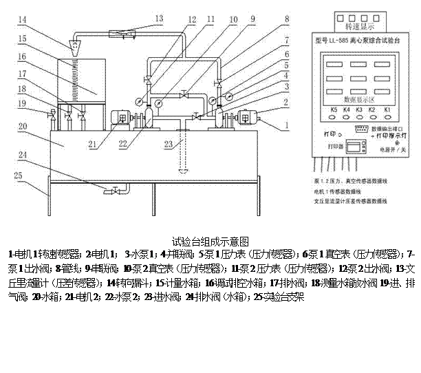實驗裝置由兩臺離心泵綜合試驗臺和兩臺計算機組成。試驗臺的組成及設(shè)備如下圖所示: