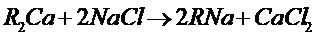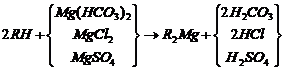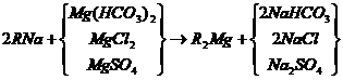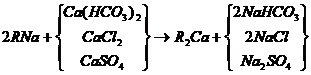 當(dāng)含有鈣鹽及鎂鹽的水通過裝有陽離子交換樹脂的交換器時(shí),水中的Ca2+及Mg2+便與樹脂中的可交換離子(Na+或H+)交換,使水中Ca2+、 Mg2+含量降低或基本上全部去除,這個(gè)過程叫做水的軟化。樹脂失效后要進(jìn)行再生,即把樹脂上吸附的鈣、鎂離子置換出來,代之以新的可交換離子。鈉離子交換用食鹽(NaCl)再生、氫離子交換用鹽酸(HCl)或硫酸(H2SO4)再生;痉磻(yīng)式如下。