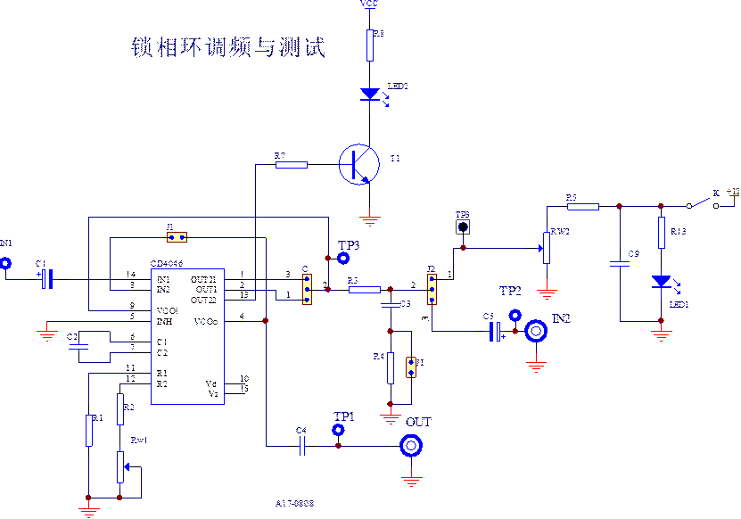 (3) 用示波器觀察VCO波形(TP1點(diǎn)),調(diào)整電位器RW1,使其自由振蕩頻率為500KHz(參考值)。
