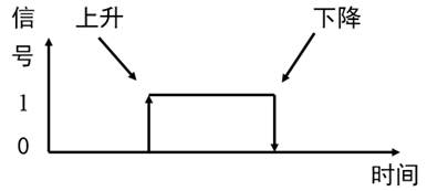 當(dāng)信號(hào)從0變1時(shí),將產(chǎn)生一個(gè)上升沿(或正跳沿),而從1變0時(shí),則產(chǎn)生一個(gè)下降沿(或負(fù)跳沿),如下圖所示。