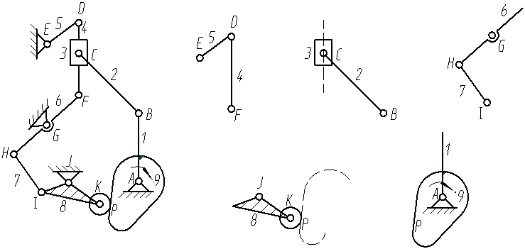 如圖4所示機構,可先除去K處的局部自由度;然后,按步驟2)計算機構的自由度F = 1,并確定凸輪為原動件;最后根據(jù)步驟3)的要領,先拆分出由構件4和5組成的Ⅱ級組,再拆分出由構件3和2及構件6和7組成的兩個Ⅱ級組及由構件8組成的單構件高副桿組,最后剩下原動件1和機架9。