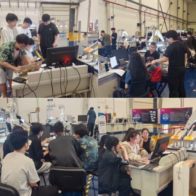 在隨后的實(shí)訓(xùn)課程中,同學(xué)們分組深入學(xué)習(xí)和實(shí)踐了三大前沿技術(shù)模塊。在ABB機(jī)器人數(shù)據(jù)采集環(huán)節(jié),各小組通過實(shí)操掌握了工業(yè)機(jī)器人數(shù)據(jù)接口配置與實(shí)時(shí)數(shù)據(jù)獲取技術(shù);在數(shù)字孿生建模技術(shù)實(shí)踐中,同學(xué)們完成了ABB機(jī)器人工作站數(shù)字孿生模型搭建與運(yùn)動(dòng)學(xué)仿真,利用虛擬同步技術(shù),實(shí)現(xiàn)物理機(jī)器人工作站與虛擬模型的實(shí)時(shí)數(shù)據(jù)映射;而在視覺+機(jī)器人工作站集成與數(shù)據(jù)映射項(xiàng)目中,大家成功實(shí)現(xiàn)了動(dòng)態(tài)環(huán)境下的實(shí)時(shí)目標(biāo)識(shí)別與抓取,構(gòu)建了數(shù)字孿生映射系統(tǒng),同步物理系統(tǒng)與虛擬模型的運(yùn)行狀態(tài)。實(shí)訓(xùn)過程中,各小組同學(xué)熱情高漲,他們有的負(fù)責(zé)程序編寫,有的專注設(shè)備調(diào)試,有的進(jìn)行數(shù)據(jù)驗(yàn)證,通過團(tuán)隊(duì)協(xié)作攻克一個(gè)又一個(gè)的技術(shù)難題。授課老師全程指導(dǎo),及時(shí)解答同學(xué)們?cè)诩蓽y試中遇到的實(shí)際問題,現(xiàn)場學(xué)習(xí)氛圍濃厚而有序。