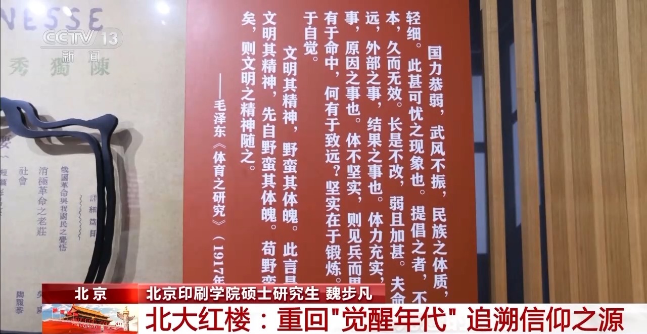 北京印刷學(xué)院碩士研究生 魏步凡:我印象比較深刻的,當(dāng)時(shí)發(fā)表在《新青年》上一篇毛澤東的文章就是《體育之研究》。當(dāng)時(shí)是陳獨(dú)秀提出了對(duì)新青年的6大標(biāo)準(zhǔn),青年時(shí)期毛澤東就覺(jué)得還應(yīng)該加入一個(gè)體育,所以發(fā)表文章說(shuō)國(guó)風(fēng)羸弱,不能只在精神上進(jìn)行豐富,體魄也要進(jìn)一步加強(qiáng)。我覺(jué)得當(dāng)時(shí)是一個(gè)非常先進(jìn)的思想。