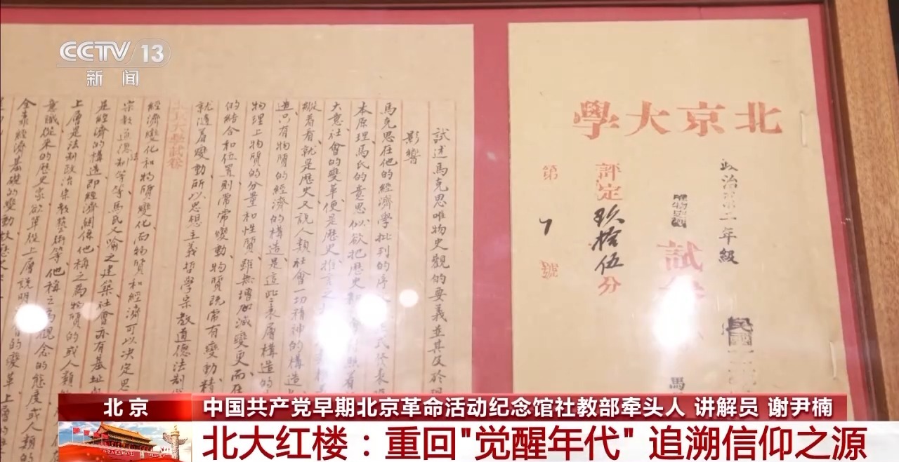 中國(guó)共產(chǎn)黨早期北京革命活動(dòng)紀(jì)念館社教部牽頭人 講解員 謝尹楠:這個(gè)是100多年前學(xué)生的試卷,當(dāng)時(shí)李大釗批閱北大哲學(xué)系學(xué)生唯物史觀的試卷,他也是中國(guó)最早將馬克思主義引進(jìn)中國(guó)高校課堂、引進(jìn)試卷的人,在封面上可以看到學(xué)生們都得到了不錯(cuò)的成績(jī)。