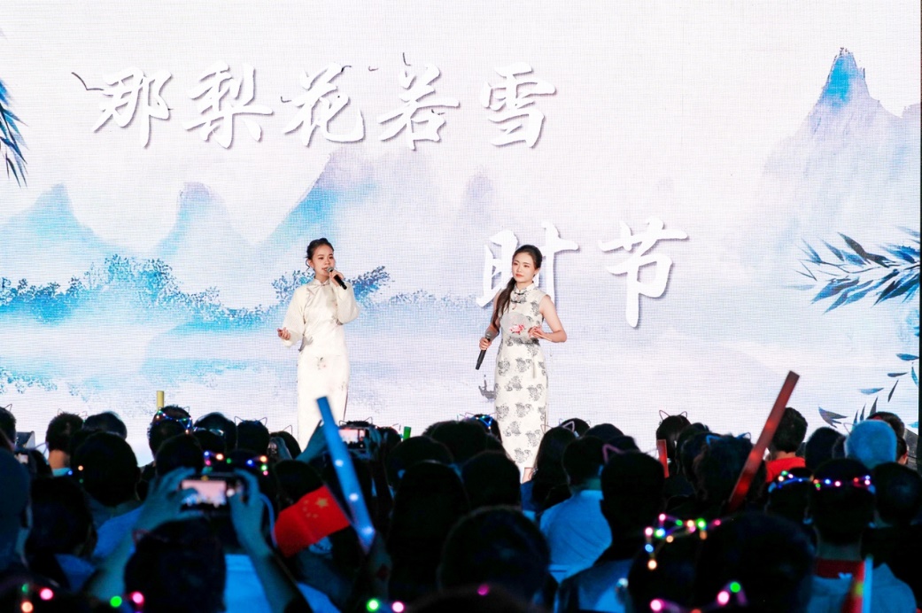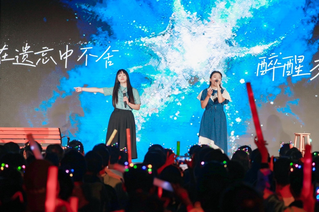 青春歌曲和經(jīng)典曲目的薈萃交融:《青春大概》《夜空中最亮的星》或青澀懵懂,或溫柔堅定,展示了追夢路上永不服輸?shù)尿湴僚c勵志,觀眾們一起揮舞手中的熒光棒、跟隨著歌手哼唱,倍感幸福充實!督裉臁贰洞和パ贰缎腋?燔嚒返冉(jīng)典歌曲更承載著北大學子對音樂與美的熱忱追求,為師生帶來一場視聽盛宴。