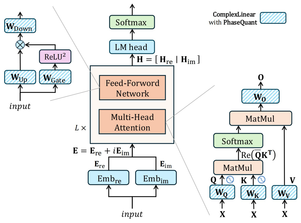 研究聚焦于大語(yǔ)言模型在真實(shí)應(yīng)用中的空間和時(shí)間瓶頸。傳統(tǒng)全精度模型參數(shù)量大、推理能耗高;盡管已有低比特量化降低了模型體積,但核心矩陣乘法仍廣泛依賴乘法運(yùn)算,難以從根本上壓縮推理時(shí)延和能耗。為此,團(tuán)隊(duì)提出在復(fù)數(shù)平面進(jìn)行2-bit量化:通過(guò)相位映射將權(quán)重限定為四個(gè)單位根{+1, −1, +i, −i},在不增加位寬的情況下充分利用2 bit信息容量,同時(shí)保持量化集合的對(duì)稱性和訓(xùn)練穩(wěn)定性。