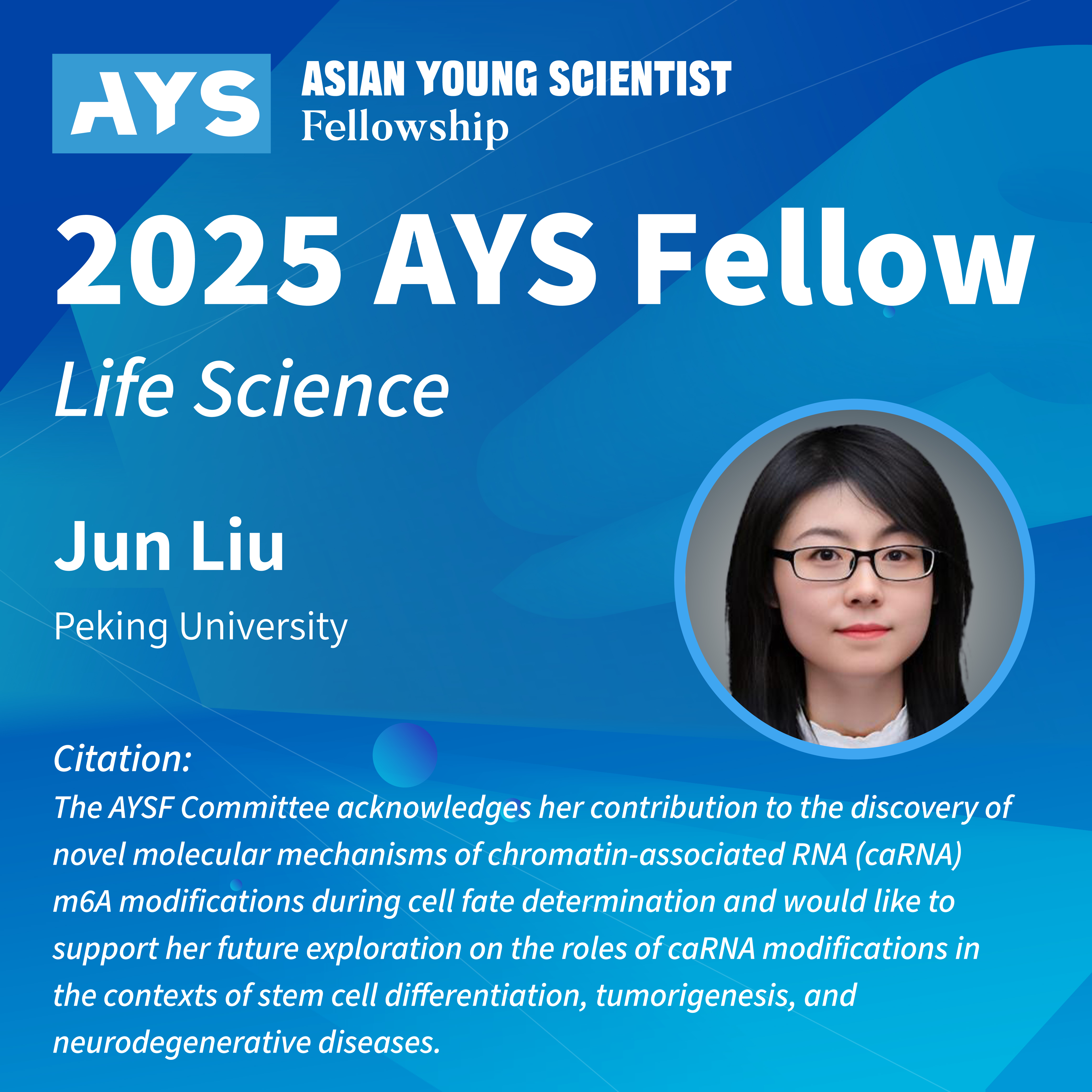 2025-09-06 07:372025年9月5日,亞洲青年科學(xué)家基金項目(Asian Young Scientist Fellowship, AYSF)正式公布2025年度的12位亞洲青年科學(xué)家基金項目研究員名單。評選面向生命科學(xué)、物質(zhì)科學(xué)、數(shù)學(xué)和計算機科學(xué)領(lǐng)域的杰出青年科學(xué)家,其中,生命科學(xué)領(lǐng)域共4位科學(xué)家入選,北京大學(xué)生命科學(xué)學(xué)院劉君研究員名列其中。